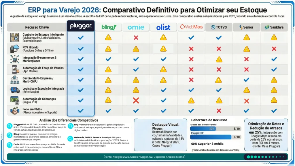 Neste comparativo de ERPs atualizado para 2026, analisamos oito soluções: Pluggar ERP, Bling, Omie, Olist (ex-Tiny), WebMais, TOTVS, Senior e Sankhya. Focamos em PMEs com faturamento de R$ 50 mil a R$ 30 milhões mensais, priorizando dores reais como emissão automática de NF-e pós-reforma tributária, roteirização de entregas, controle de estoque inteligente e integração multicanal.